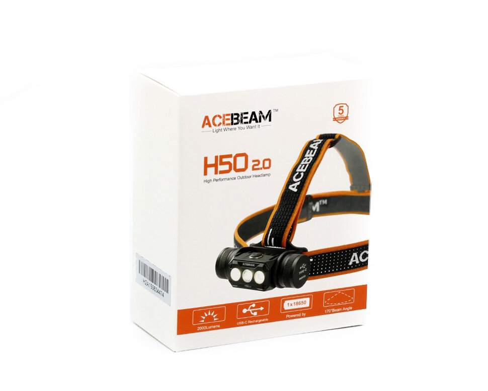 Налобный фонарь Acebeam H50 V2.0, 1 х 18650, 3 диод, 6 режимов, 137 метров, 2000 люмен (Комплект)