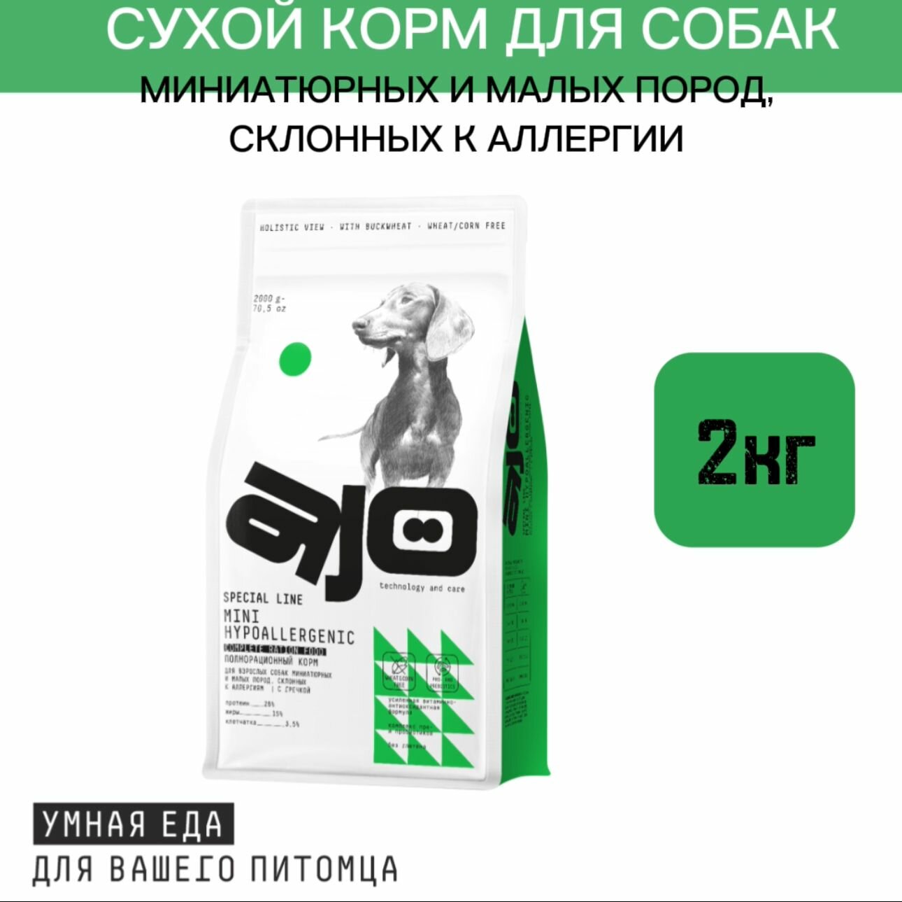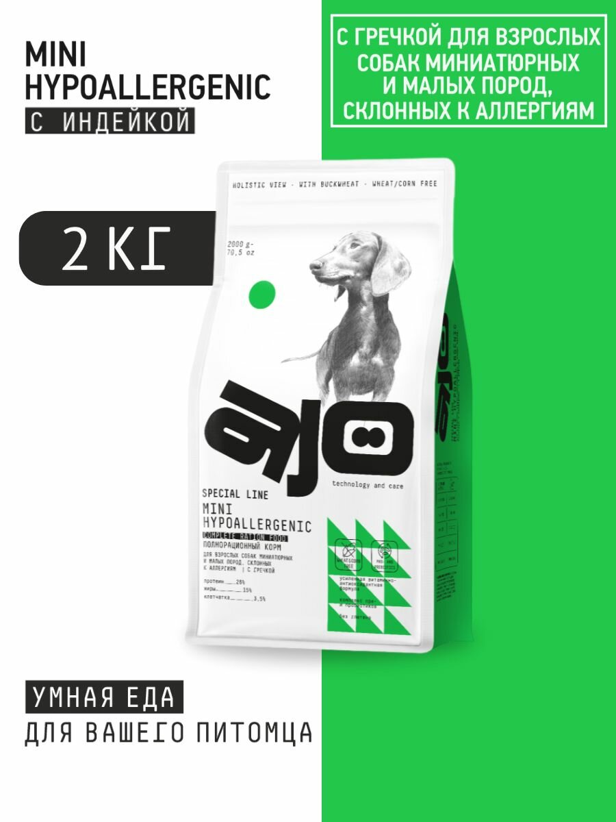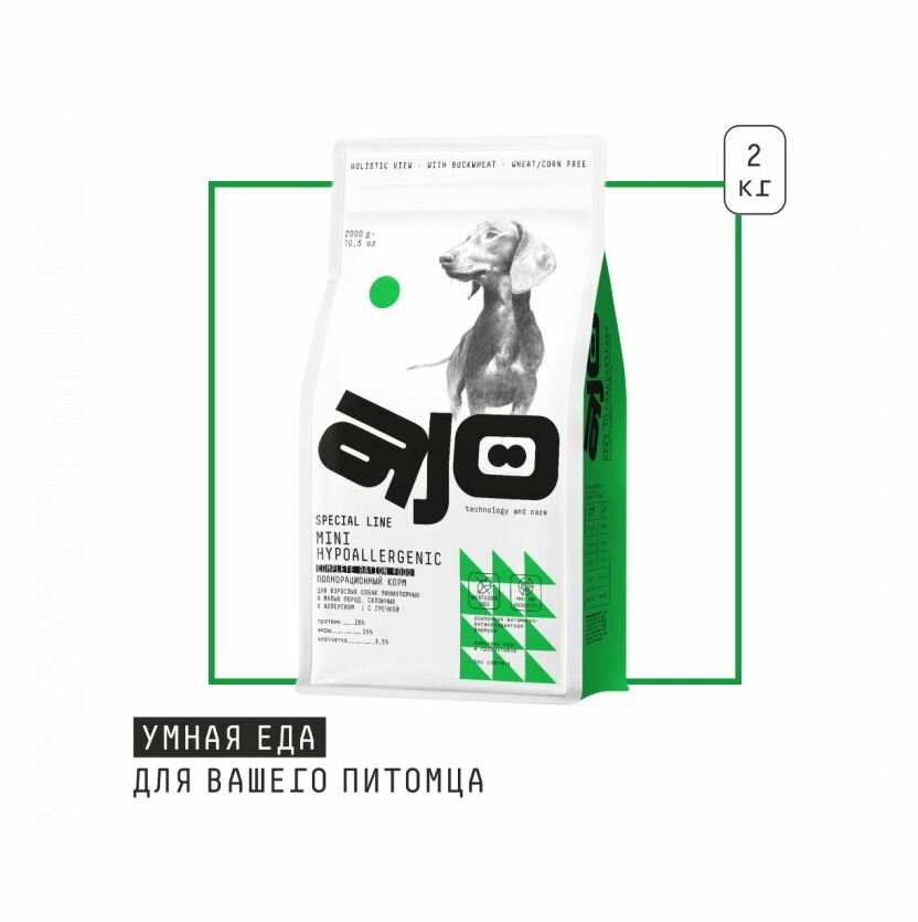 Купить Сухой корм AJO Mini Hypoallergenic с гречкой для взрослых собак миниатюрных и малых пород, склонных к аллергиям 2 кг