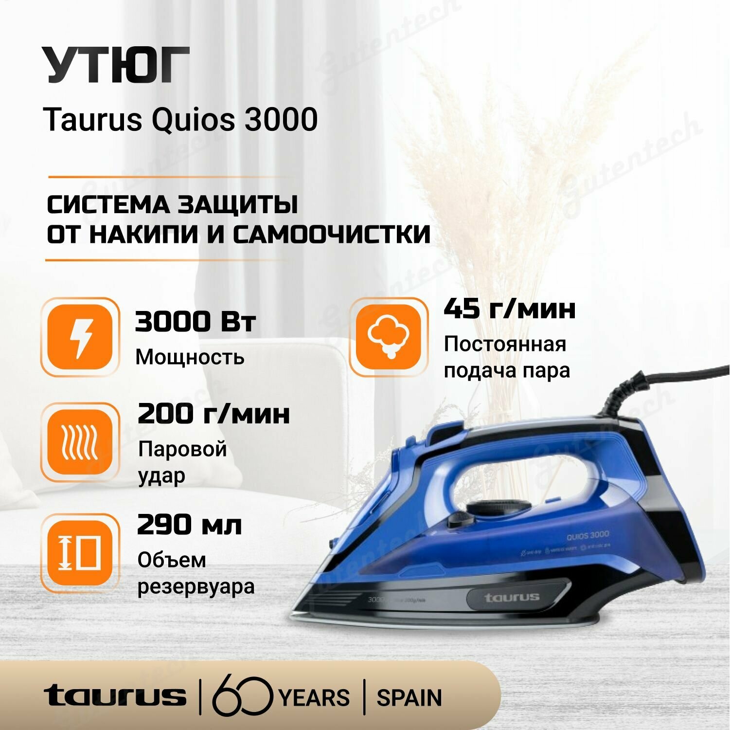 Утюг Taurus Quios / мощность 3000 Вт / керамическая подошва / резервуар 290 мл / сине-черный интересное: