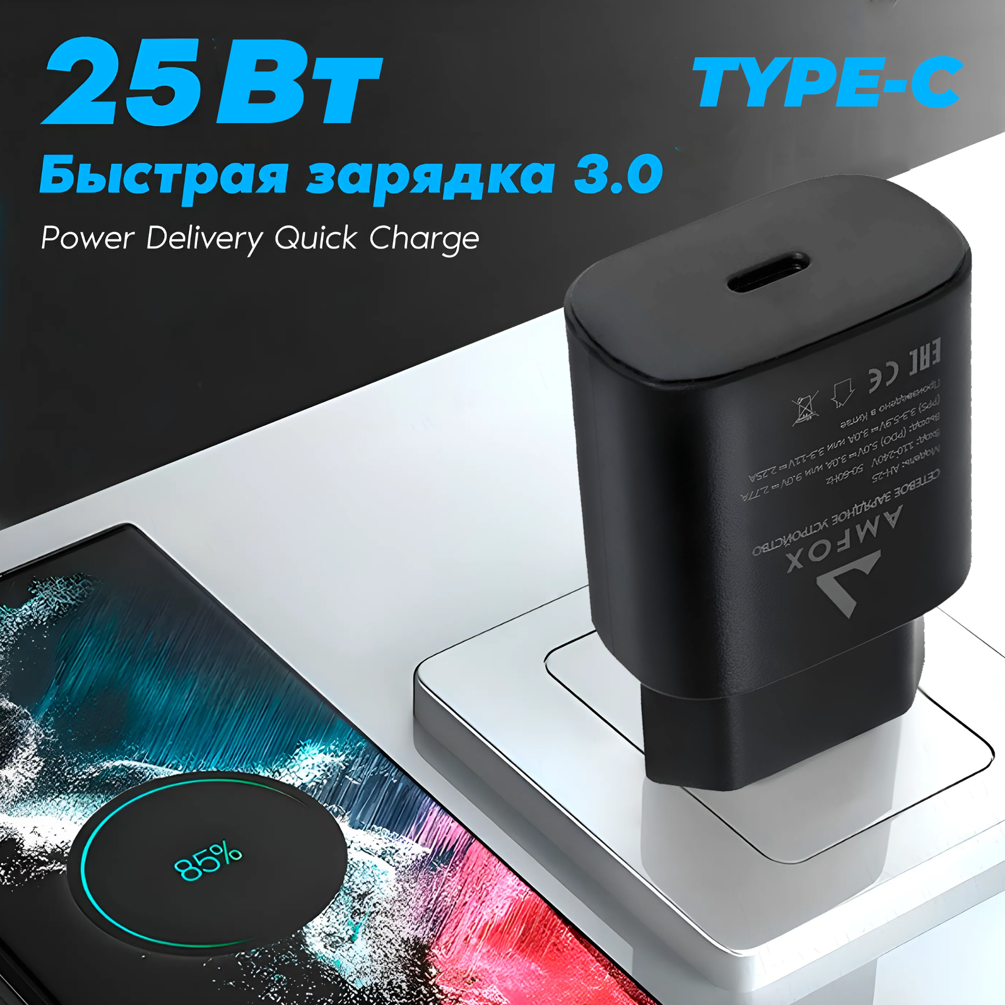 Сетевая зарядка для телефона AMFOX AH-25 универсальная с разъемом Type-C, 25 Вт, белая / зарядное устройство, блок питания адаптер айфон