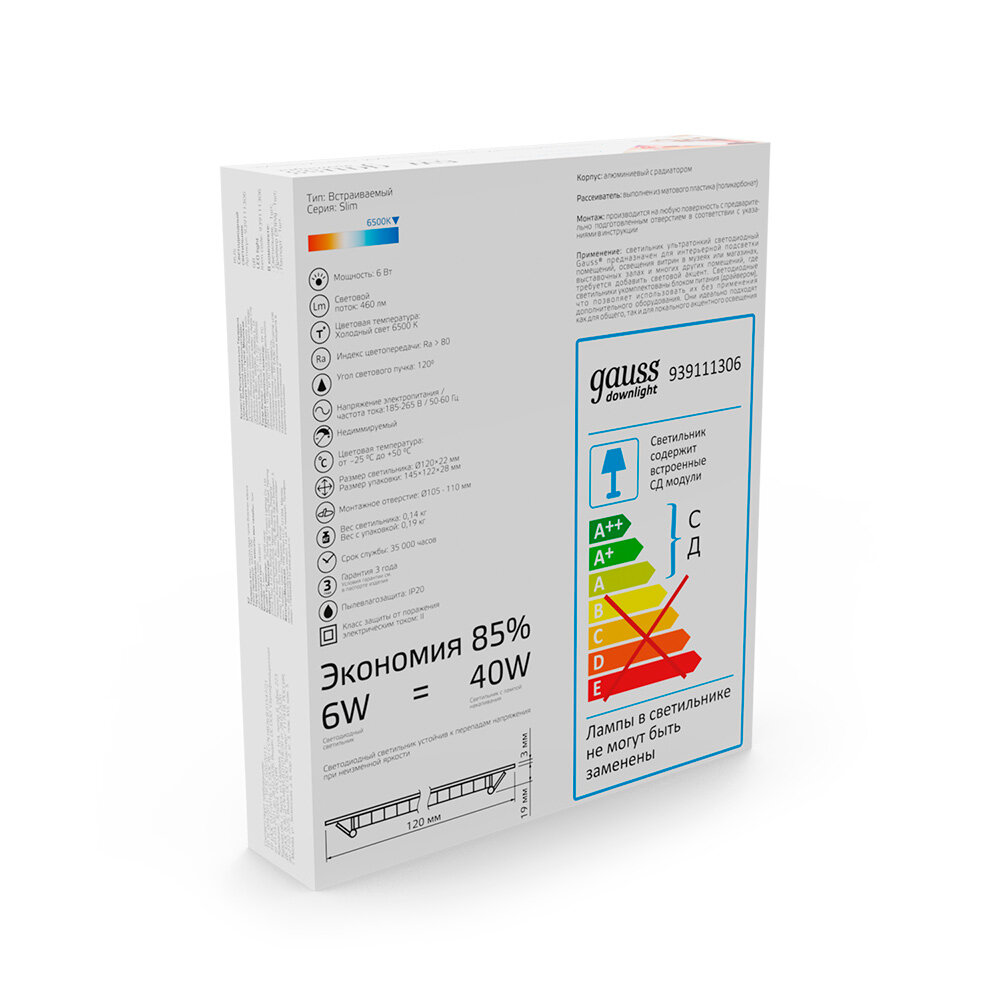 Встраиваемый светильник Gauss ультратонкий круглый IP20 6W,120х22, 105, 6500K 460лм 1/20