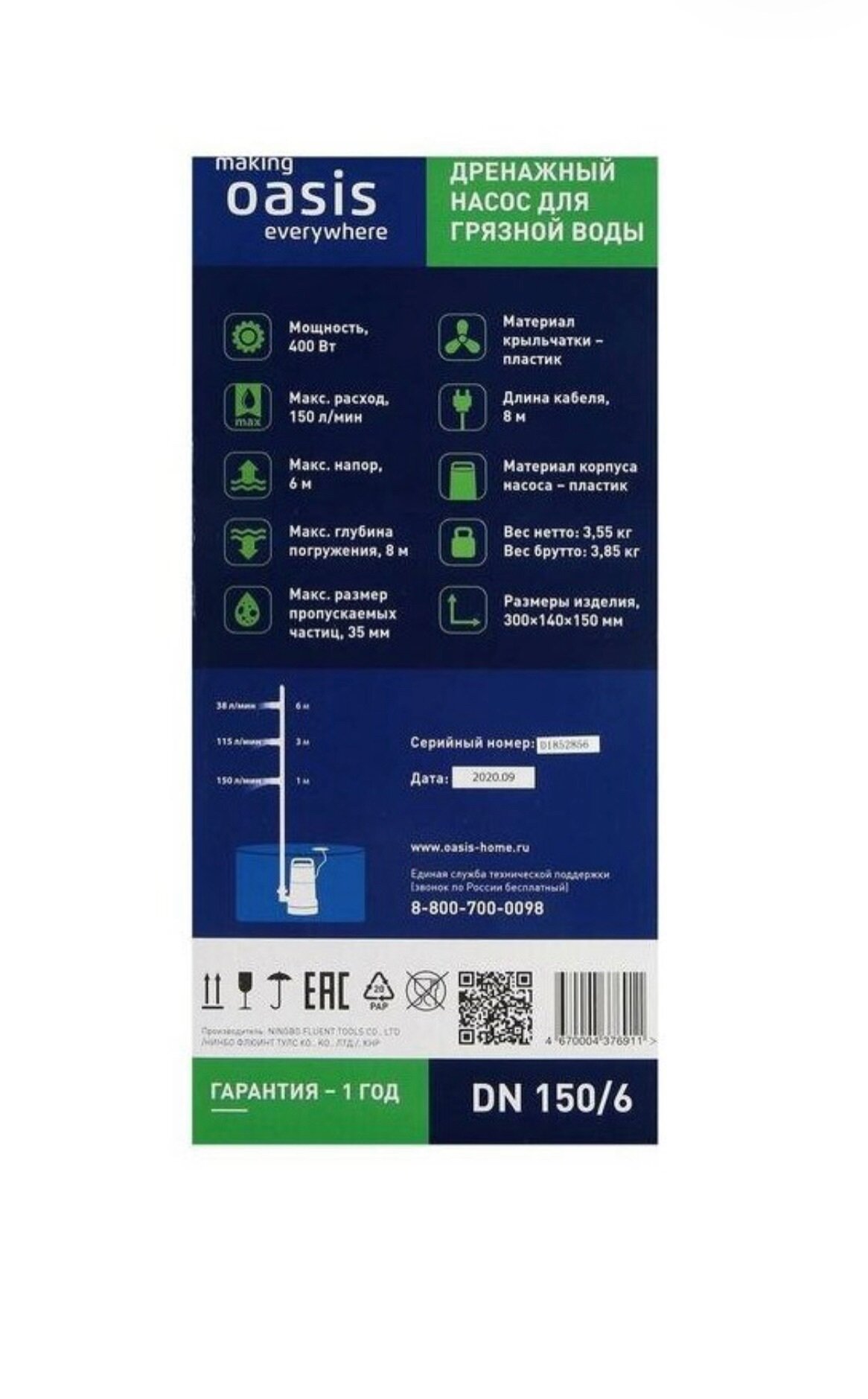 Дренажный Oasis насос "making everywhere" для грязной воды DV 150/6
