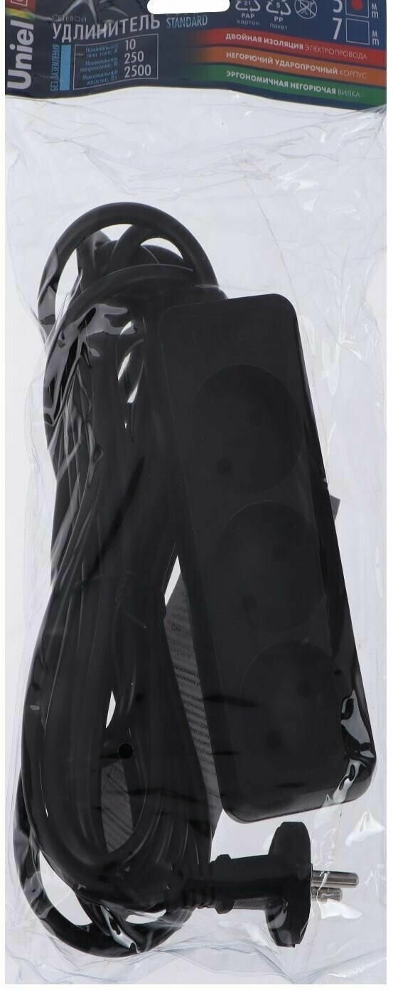 Uniel Удлинитель Uniel Standart, 3 розетки, 5 м, 10 А, 2500 Вт, без з/к, черный
