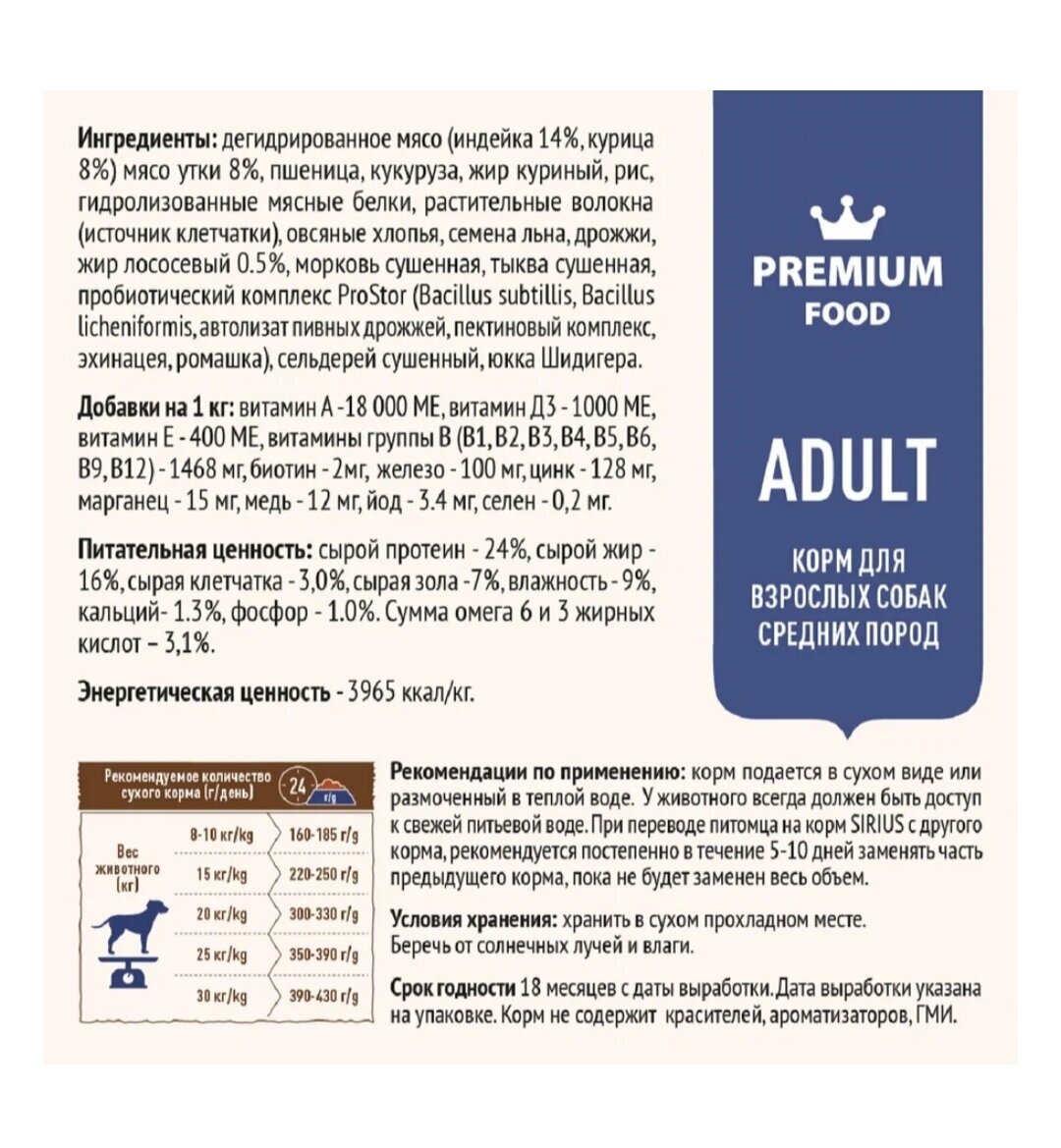 Ниже Вы можете прочитать отзывы на Сухой корм для собак средних пород SIRIUS, индейка и утка с овощами 2 кг, ознакомится с подробными характеристиками, посмотреть интересные обзоры и фотографии на Сухой корм для собак средних пород SIRIUS, индейка и утка с овощами 2 кг.