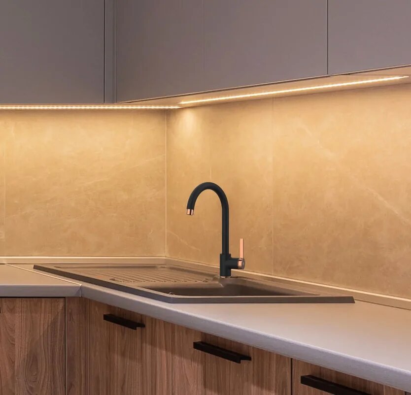 Смеситель GPD Gildo MTE165-S-R для кухонной мойки, черный, розовое золото