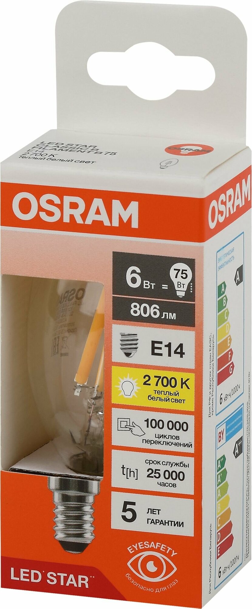 Светодиодная лампа Osram LED Star CL B75 6W/827 220-240V FIL CL E14 806lm .
