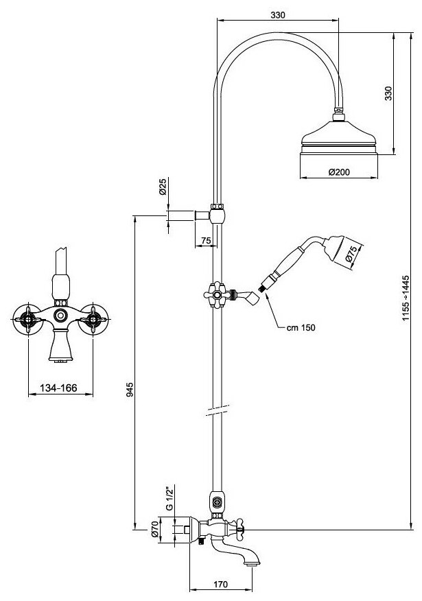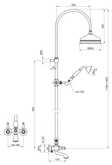 | Дополнительная информация | высота стойки для душа: 1445 мм; диаметр душевой лейки: 75 мм; диаметр верхнего душа: 200 мм |