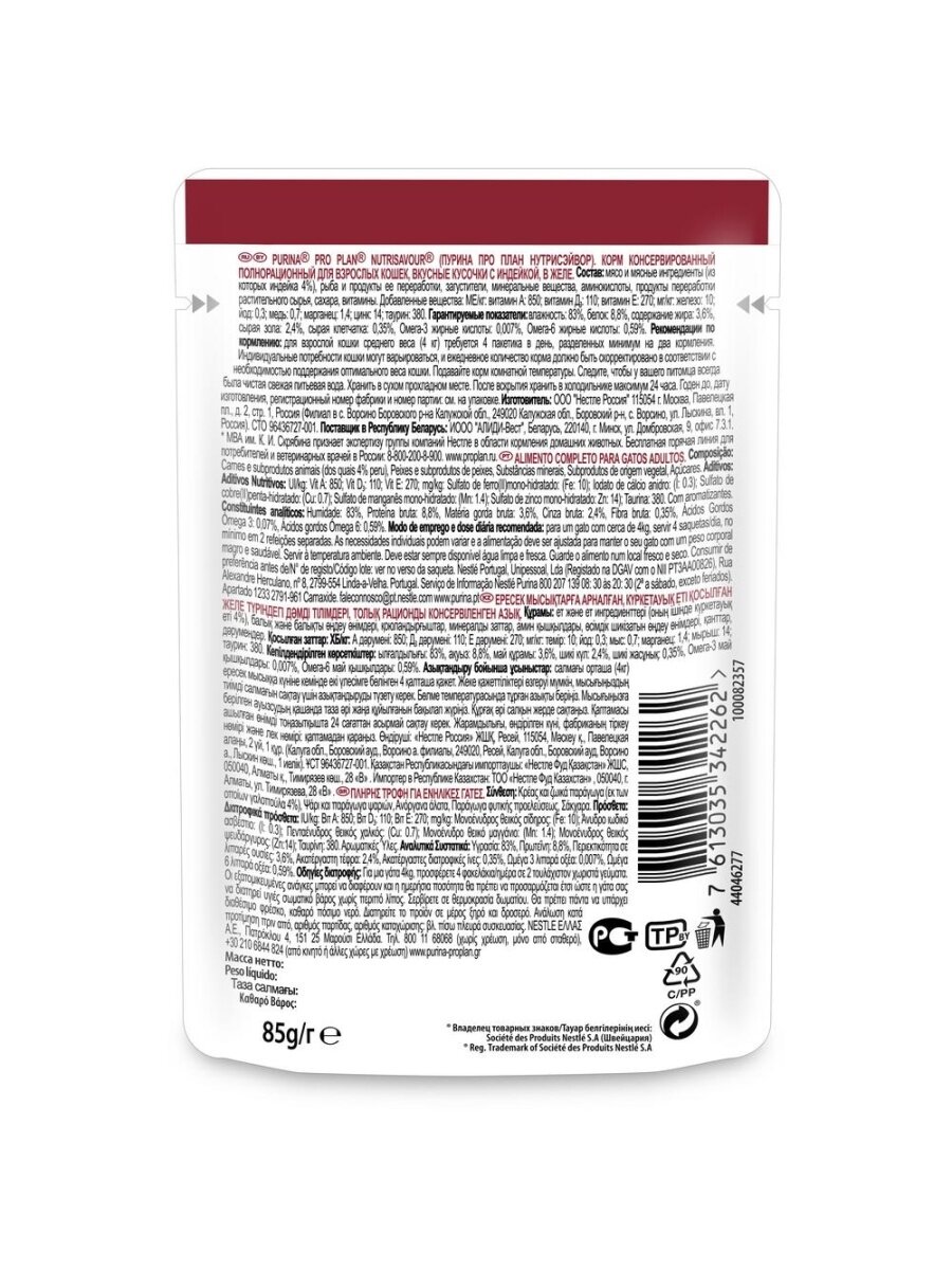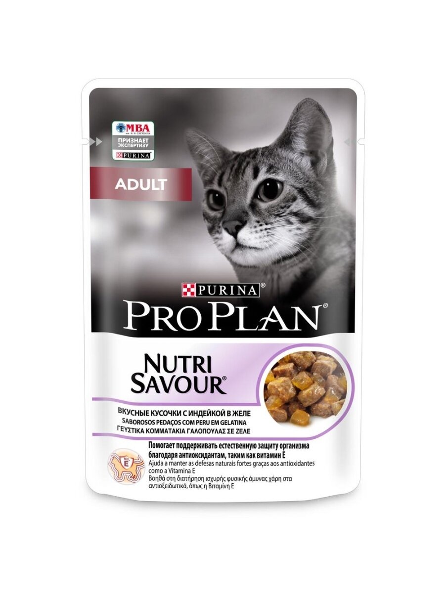 Влажный корм Pro Plan Adult Nutri Savour для взрослых кошек, кусочки с индейкой в желе 85 г х 78 шт