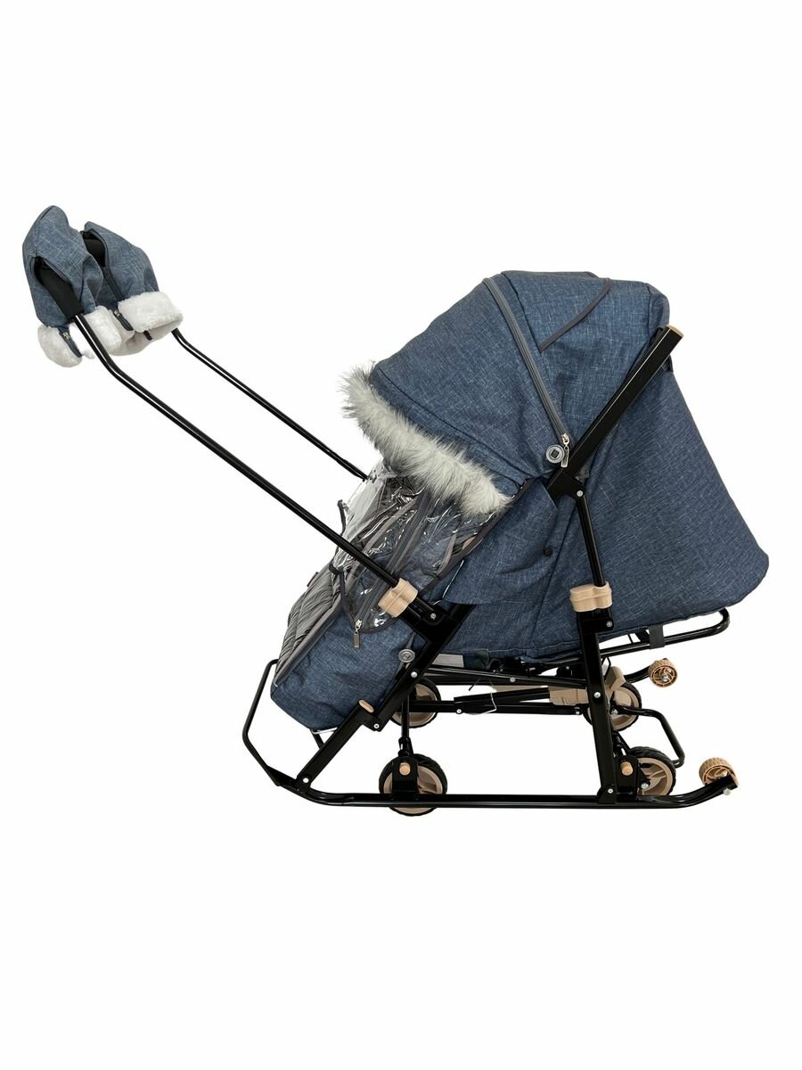 Санки коляска детские зимние Galaxy Glory gloss с колесами и перекидной ручкой, темно-синий лен