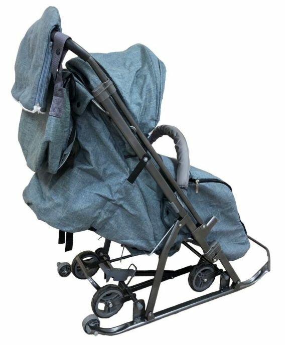 | Минусы: | Как и все остальные санки-коляски не удобны: если ехать по сугробам на лыжах, но на колёсиках собирается снег,
