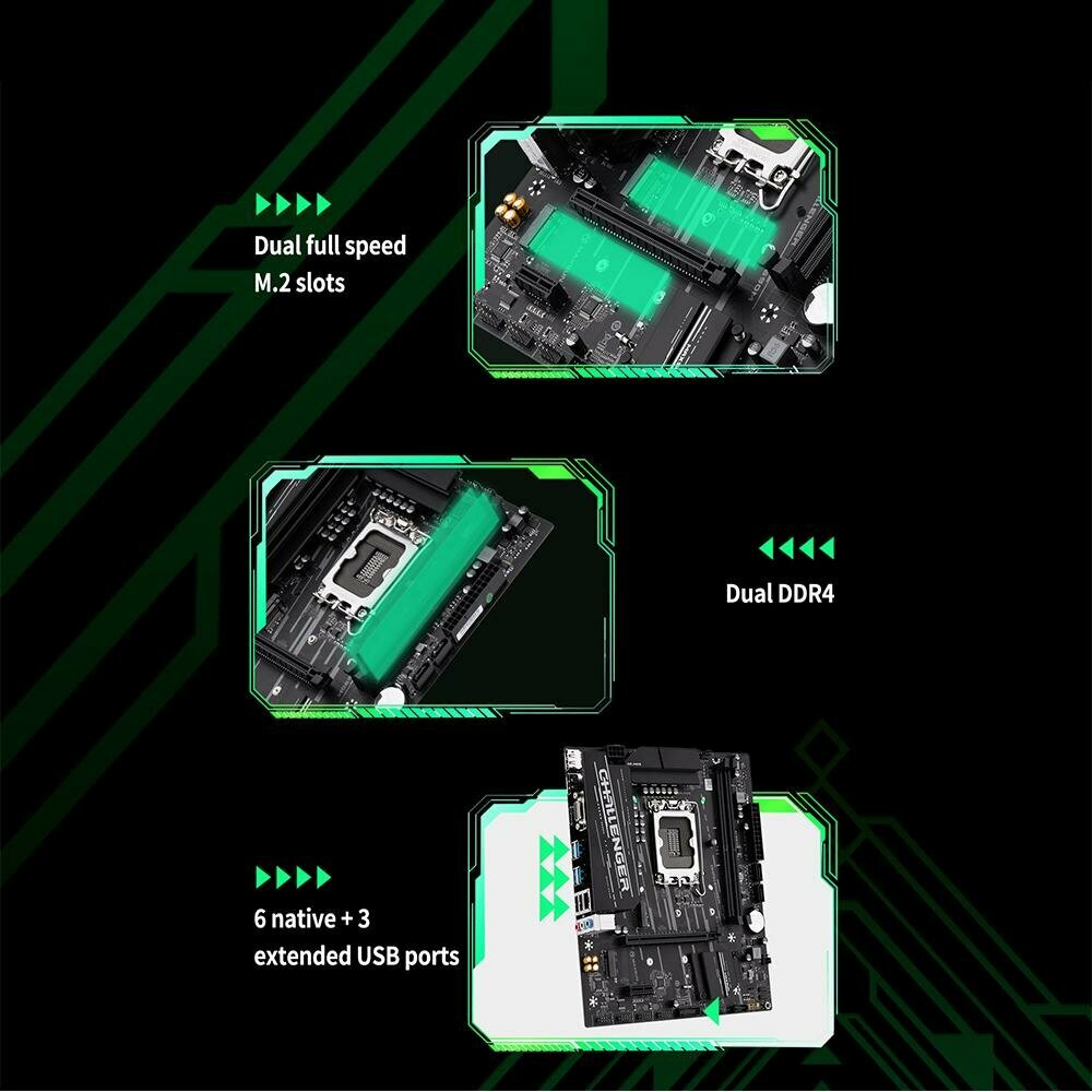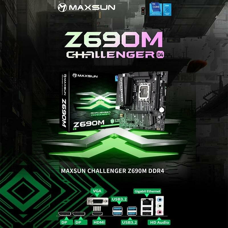 Материнская плата MAXSUN Challenger Z690M, Socket1700, mATX, Retail, 2xDDR4, PCIe4.0, 2xM.2, GLAN, 6xUSB2, 6xUSB3, CPU TDP 125Вт, VGA, HDMI, 2xDP (MSCH-Z690M)