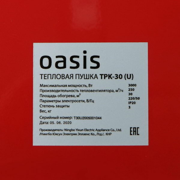 Тепловая пушка электрическая Oasis, модель TPK-30, 3000 Вт, до 30 кв. м