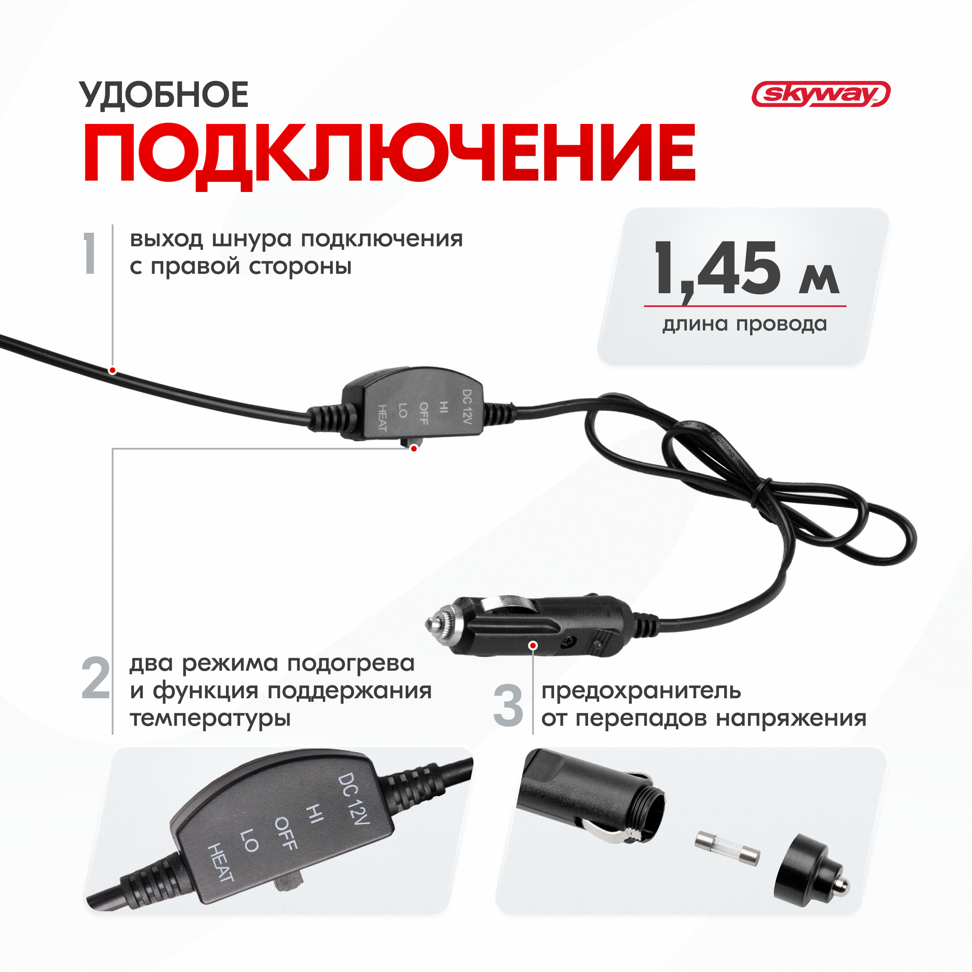 SKYWAY S02201018 Накидка с подогревом 12 В Skyway с регулятором 2 режима черная 95 х 47 см 2 шнура слева и справа *