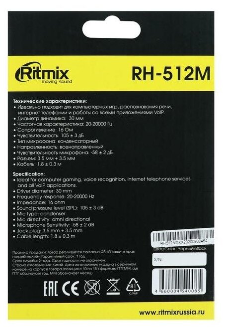 Наушники Ritmix RH-512M компьютерные микрофон 105 дБ 16 Ом 3.5 мм 1.8 м черные