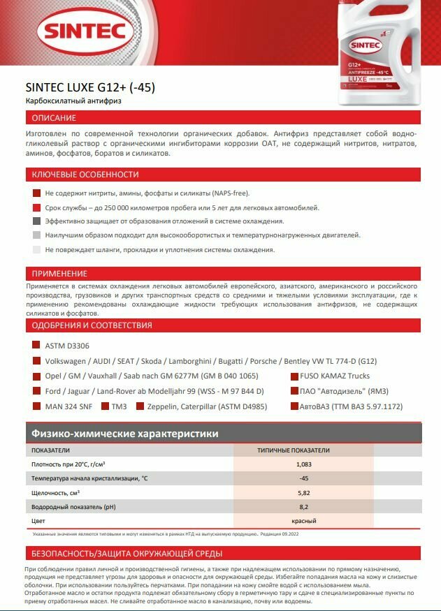 Охлаждающая Жидкость Sintec Antifreeze Luxe G12+ Red -45 1Кг SINTEC арт. 990559