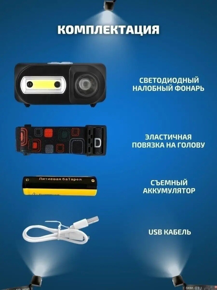 Сверхяркий популярнейший налобный фонарь аккумуляторный с тремя интегрированными фонарями и регулировкой угла аккумуляторный