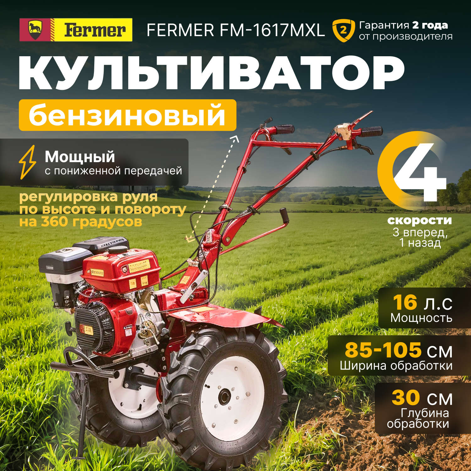 Культиватор бензиновый FERMER FM-1617MXL колеса 6.50-12 (16 л.с., шир. 105 см, колесо 6.50-12, без ВОМ, передач 3+1, пониженная передача) (FM-1617MXL