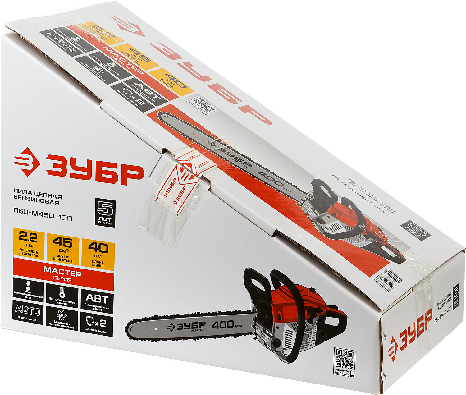 Купить Пила цепная бензиновая, ЗУБР ПБЦ-М450 40П, хромир. цилиндр, праймер, 45 см3 (1,6 кВт), шина 40 см, 11500 об/мин