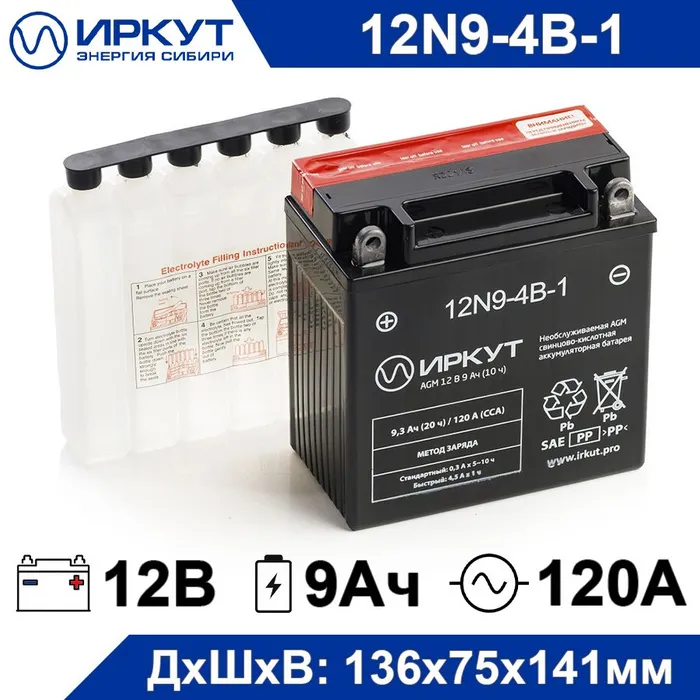 Мото аккумулятор стартерный иркут 12N9-4B-1 12В 9Ач прямая полярность 120А (12V 9Ah), AGM, для мотоцикла, квадроцикла, скутера, гидроцикла, генератора