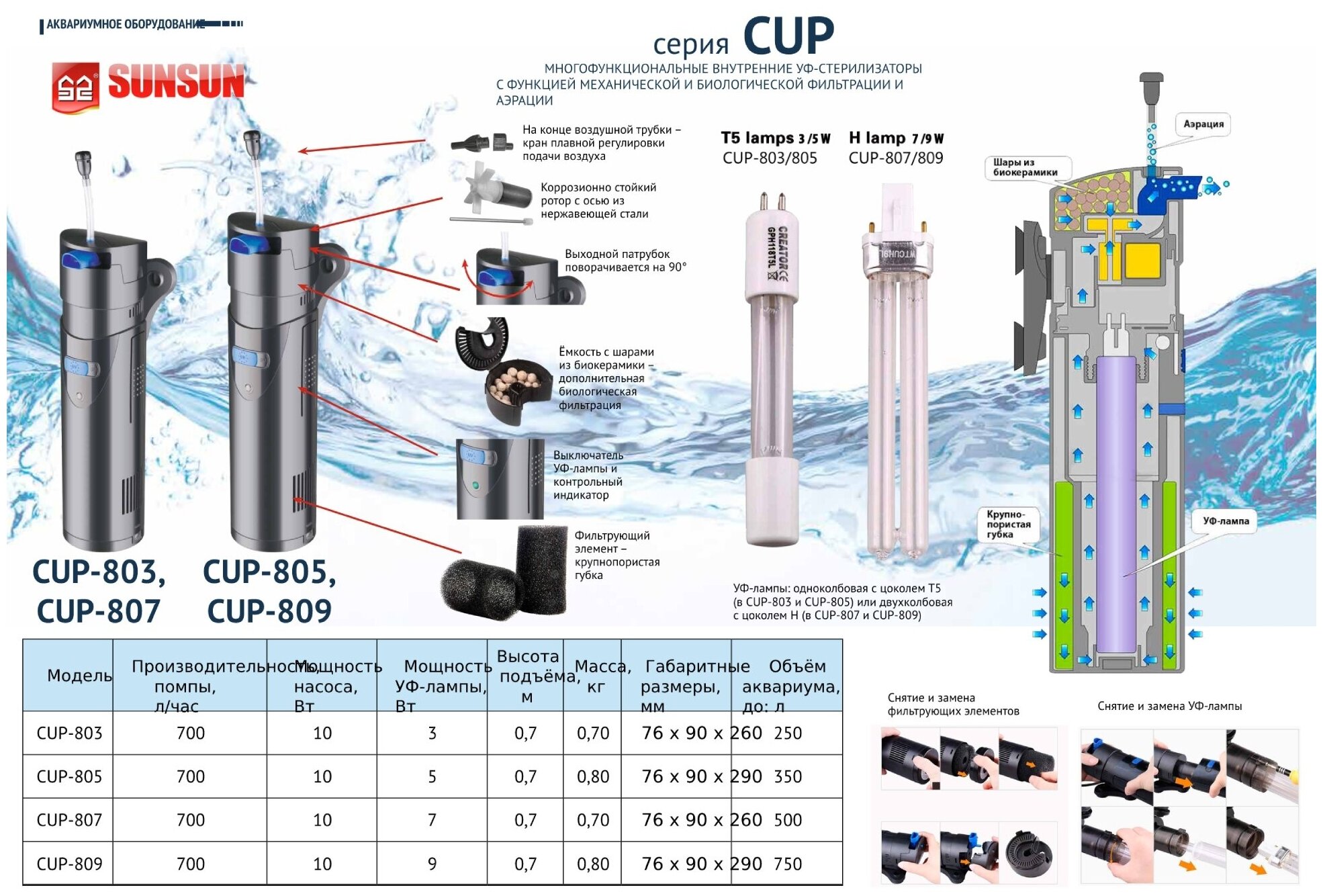 SUNSUN Фильтр внутренний SUNSUN CUP-805 с помпой и стерилизатором 16 Вт, лампа 5 Вт, помпа 10 Вт, 700 л/ч