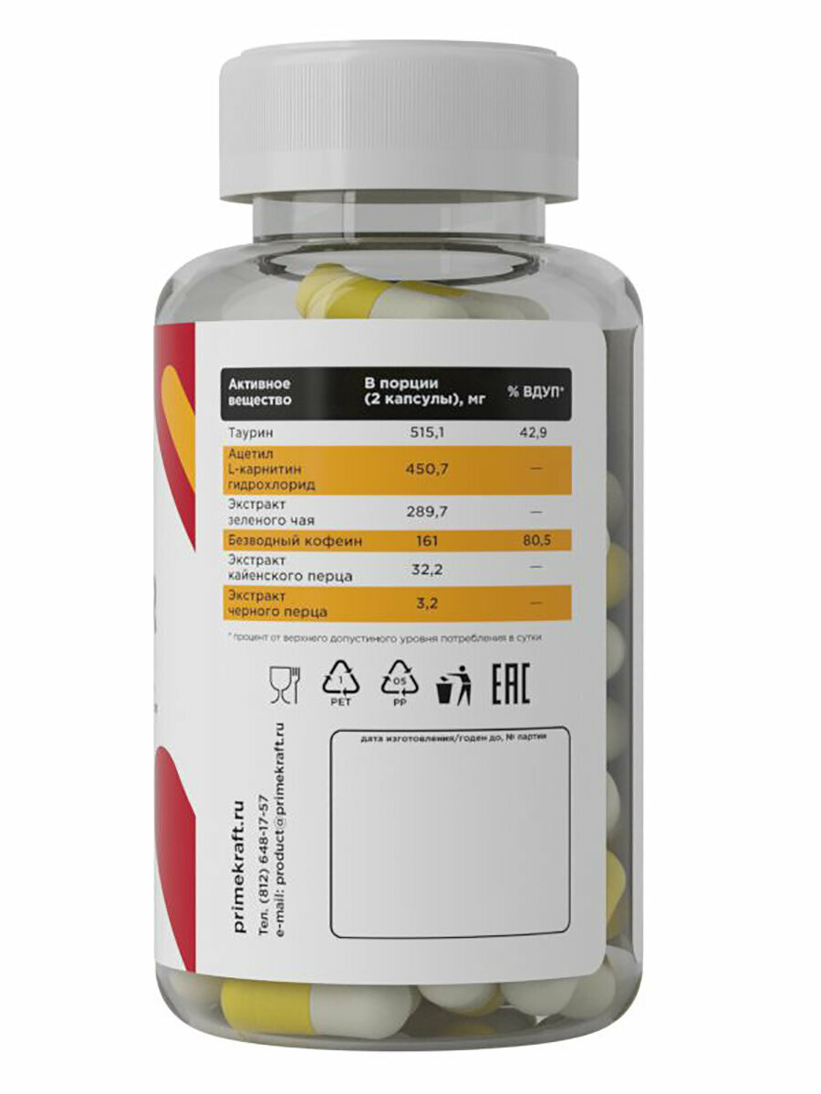 | Дополнительная информация | состав: таурин, ацетил-L-карнитин гидрохлорид, экстракт зеленого чая, безводный кофеин, экстракт кайенского перца, стеарат магния, экстракт черного перца, желатин (капсула). |