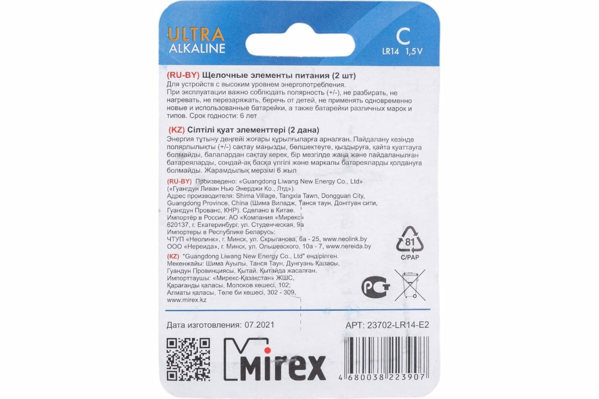 Ниже Вы можете прочитать отзывы на Батарейки щелочные (алкалиновые) Mirex LR14 / типоразмер C 1,5V 2 шт, ознакомится с подробными характеристиками, посмотреть интересные обзоры и фотографии на Батарейки щелочные (алкалиновые) Mirex LR14 / типоразмер C 1,5V 2 шт.