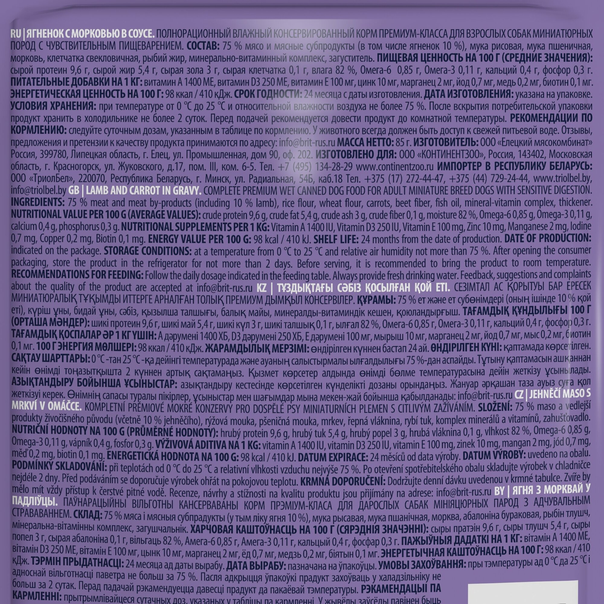 Консервированный корм BRIT PREMIUM DOG MINI LUMB & CARROT для взрослых собак маленьких пород с ягненком и морковью в соусе (85 гр х 14 шт)