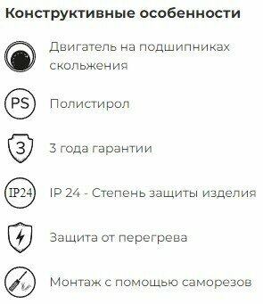 | Дополнительная информация | степень защиты IP 24; двигатель на подшипниках скольжения; монтажные размеры: ширина 140 мм, высота 140 мм; монтаж осуществляется с помощью саморезов, которые входят в комплект |