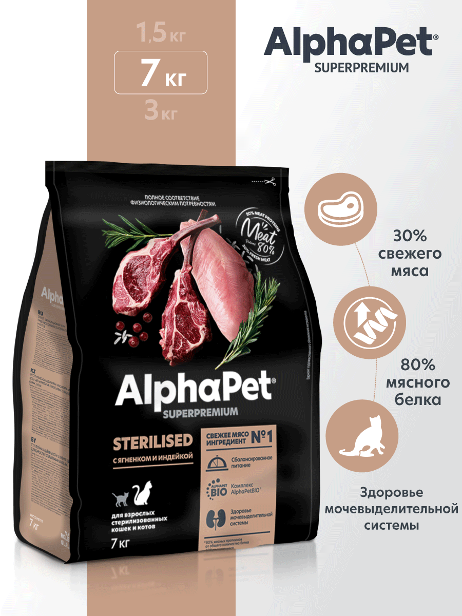 Купить AlphaPet SUPERPREMIUM STERILISED сухой корм для взрослых стерилизованных кошек и котов с ягненком и индейкой 7кг