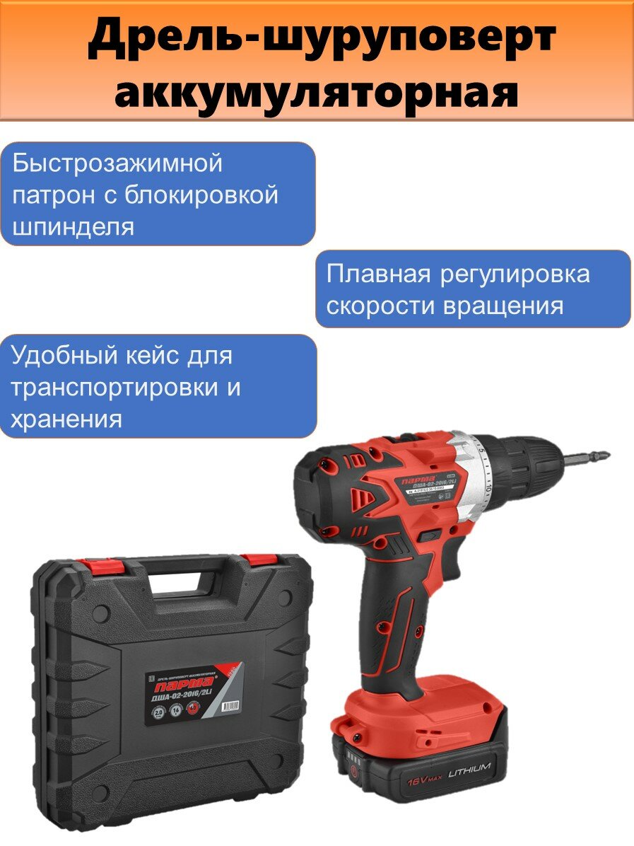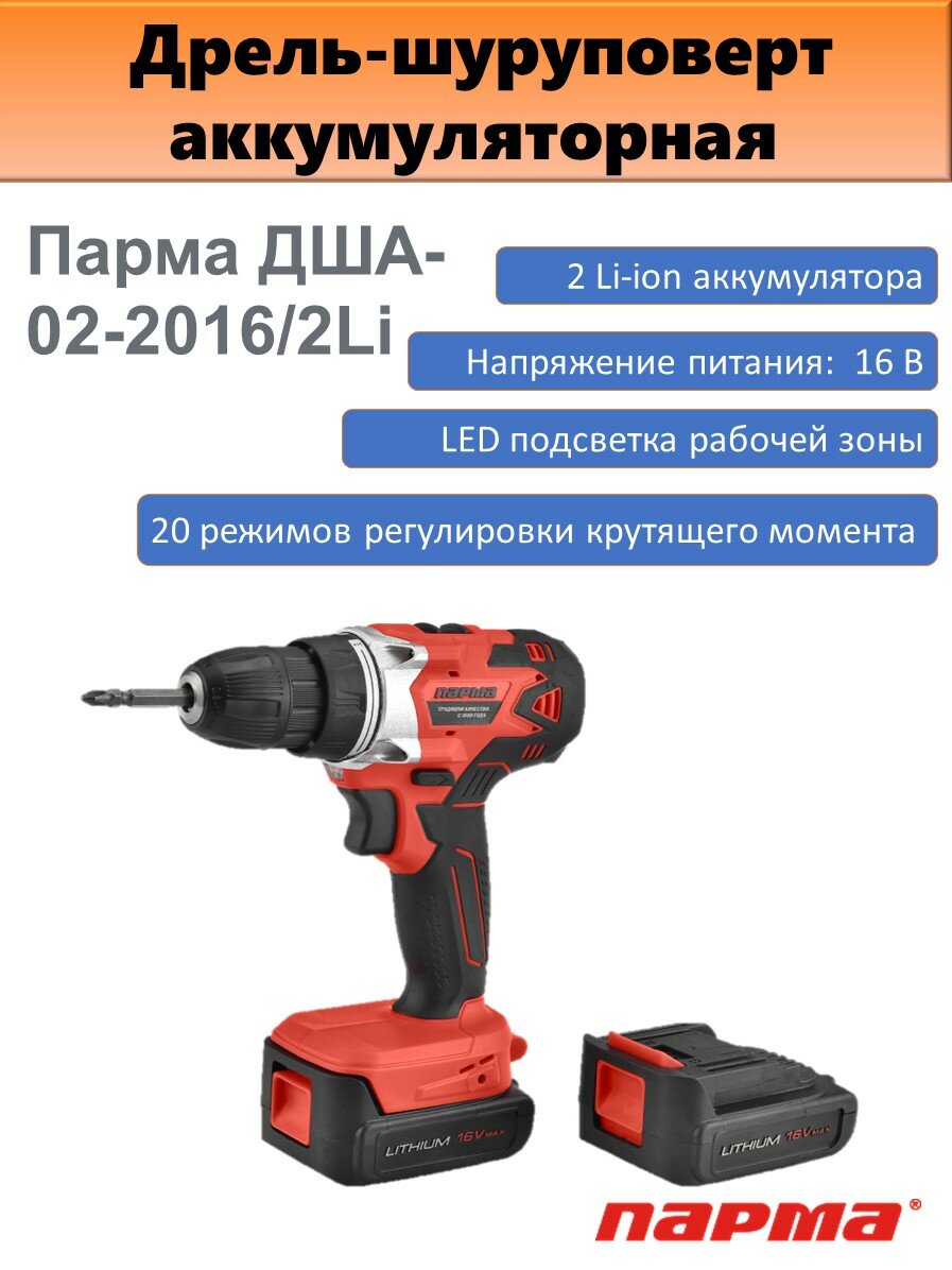Дрель-шуруповерт аккумуляторная Парма ДША-02-2016/2Li арт. 02.021.00015
