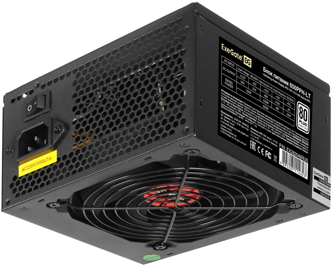 Блок питания 650W ExeGate 80 PLUS® 650PPH-LT (ATX, APFC, КПД 82% (80 PLUS), 12cm fan, 24pin, 2x(4+4)pin, 2xPCI-E, 6xSATA, 3xIDE, black, Color Box) EX282046RUS