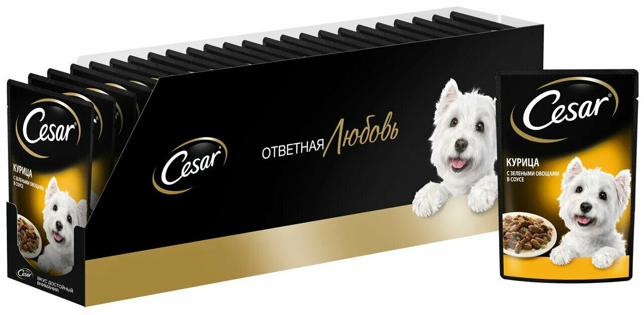 Влажный корм Cesar для взрослых собак, с курицей и зелеными овощами в соусе, 85г х 28шт