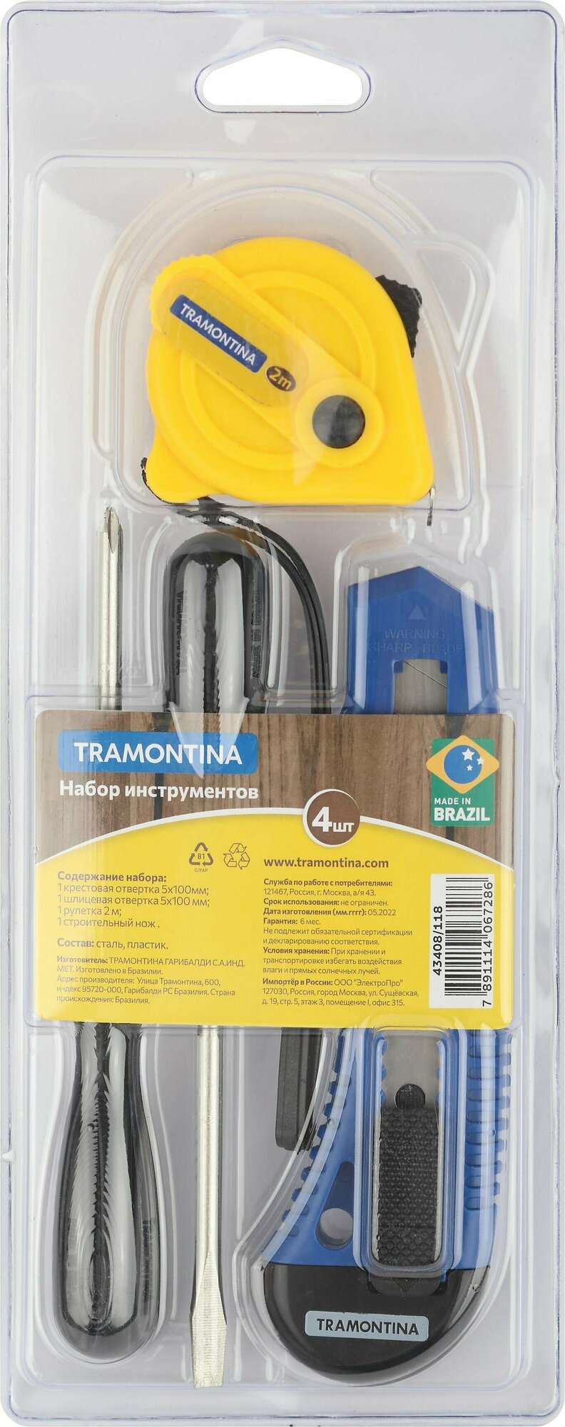 Набор инструментов Tramontina MASTER 43408/118 4 предмета (2 отвертки, строительный нож, рулетка 2 м)