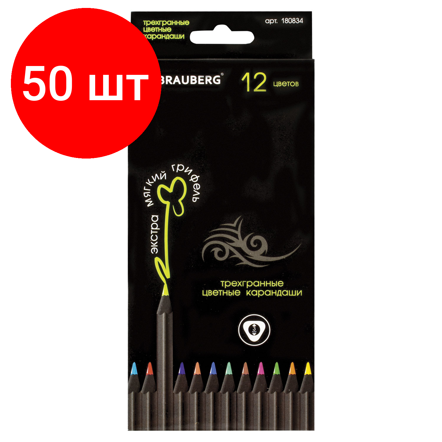 Карандаши цветные BRAUBERG "Black Jack", 12 цв., трехгранные, черное дерево, заточенные, картонная упаковка, 180834 упаковка 3 шт.