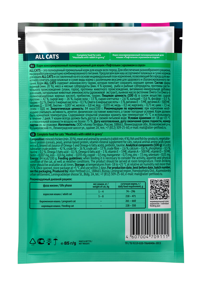 Корм All Cats (в соусе) для кошек, с тефтельками из кролика, 85 г x 28 шт интересное: