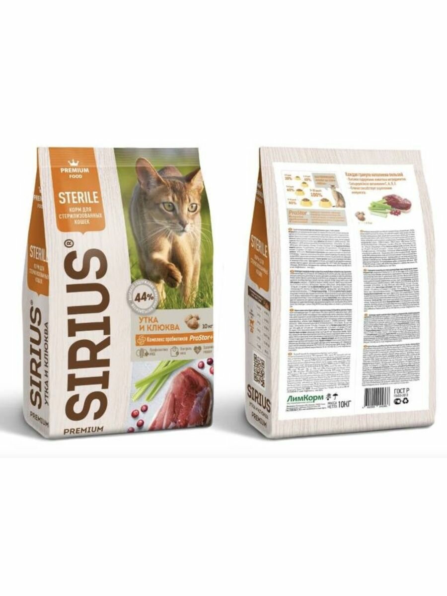 Сухой корм сириус SIRIUS PREMIUM для стерилизованных кошек, утка и клюква, 1.5 кг