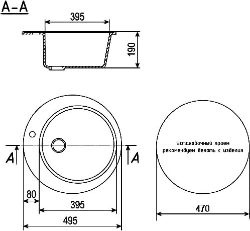 Мойка Ulgran, мрамор, U-405-308, (D-495*190 мм), черный, сифон и сливная арматура