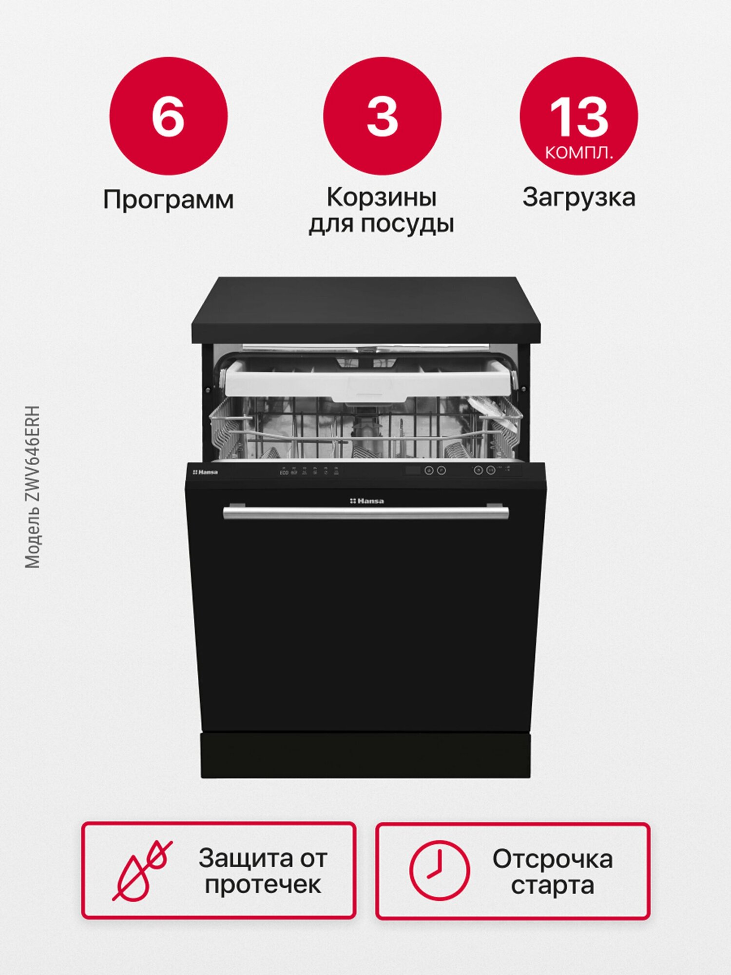 Посудомоечная машина Hansa ZWV646ERH, 60 см, с защитой от протечек, 6 программ, с 3 корзинами, отсрочка старта и половинная загрузка, отдельностоящая