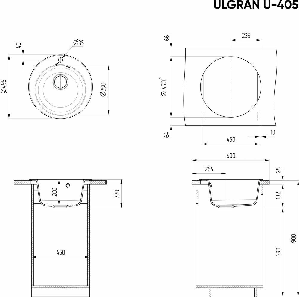 Мойка кухонная Ulgran из искусственного мрамора круглая U-405, цвет: ультра-черный, база: 47х47 см, арт. U-405-344