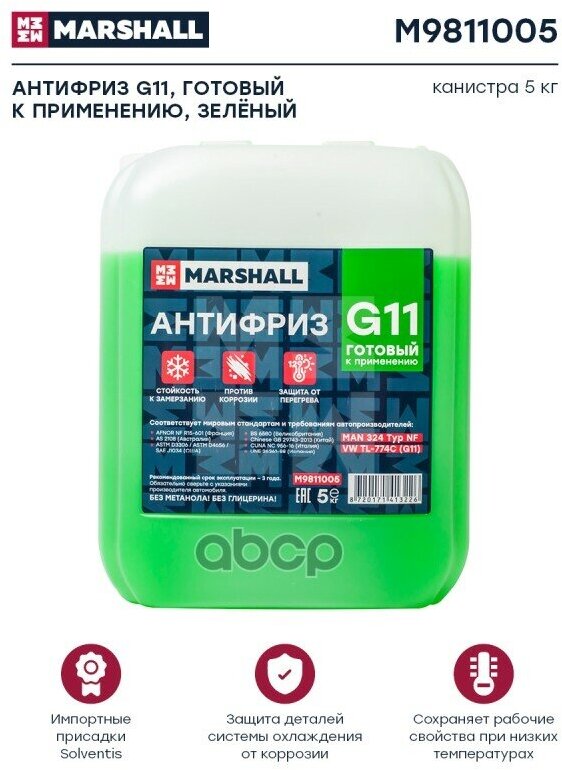 Антифриз Marshall G11, Готовый К Применению, Зеленый, Канистра 5 Кг. (M9811005) MARSHALL арт. M9811005