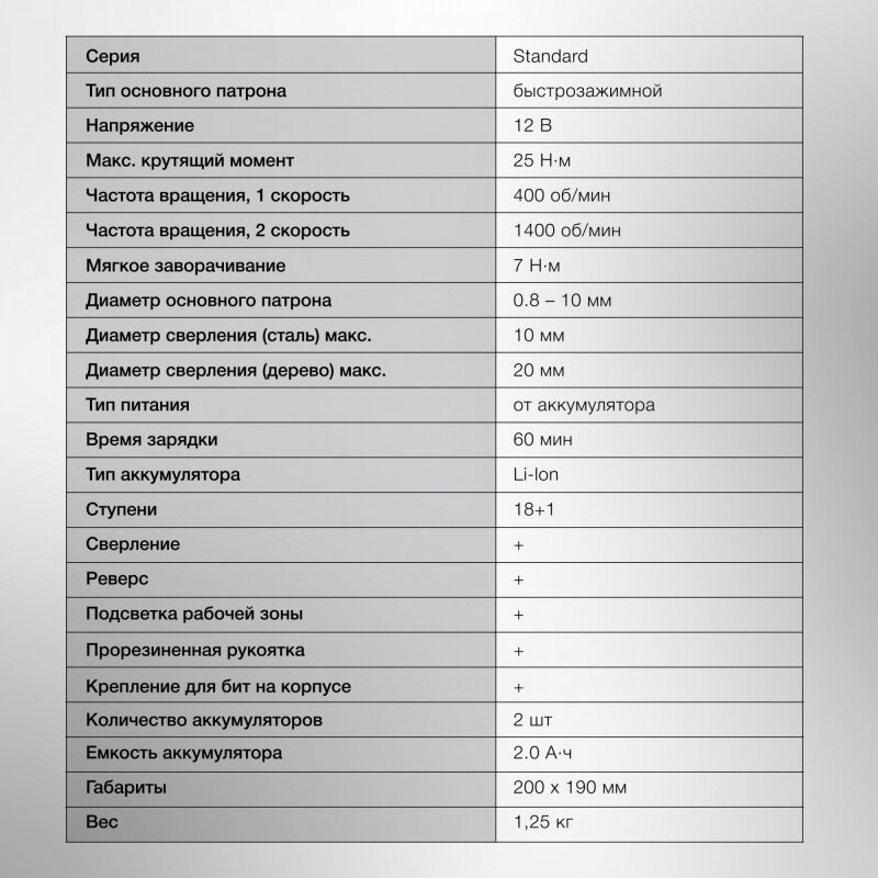 | Плюсы: | Удобная прорезиненная ручка с аккумулятором. Аккумы 2 штуки на 2 Ач. Есть рампа магнитная для крепления бит. |