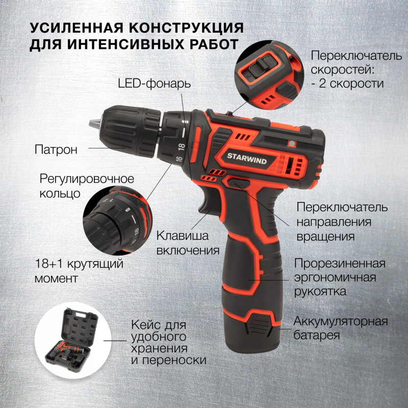 Дрель-шуруповерт StarWind DS-10-12H-2 2Ач, с двумя аккумуляторами [kwcd1909] интересное: