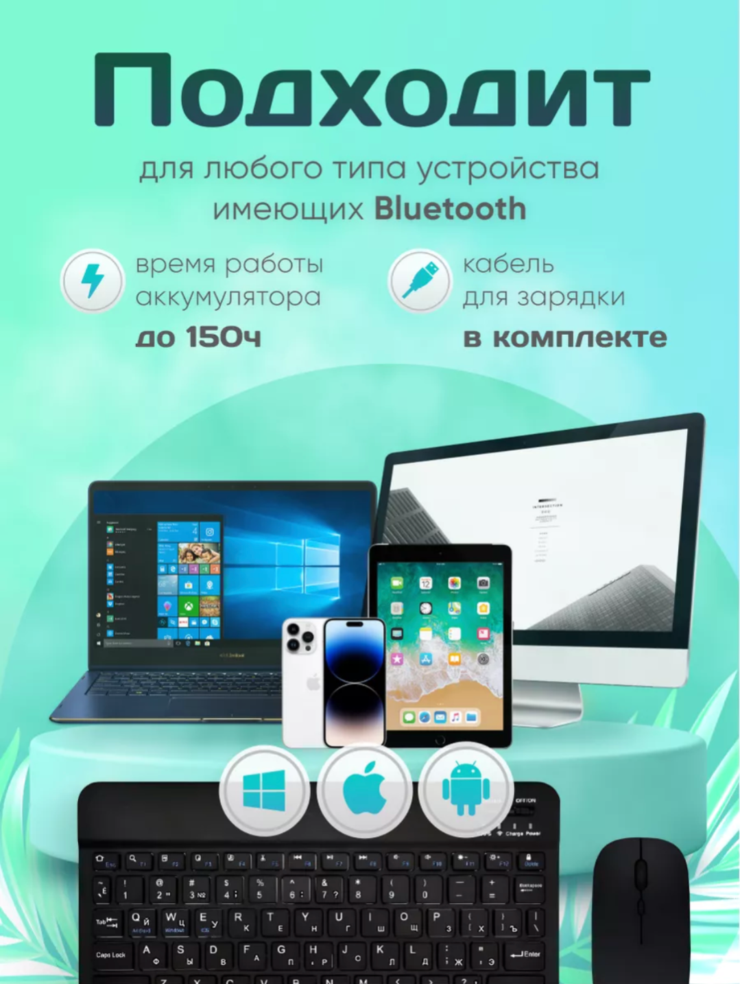 | Плюсы: | Компактная клавиатура и мышь. По Bluetooth подключилось к планшету и смартфону без проблем. |