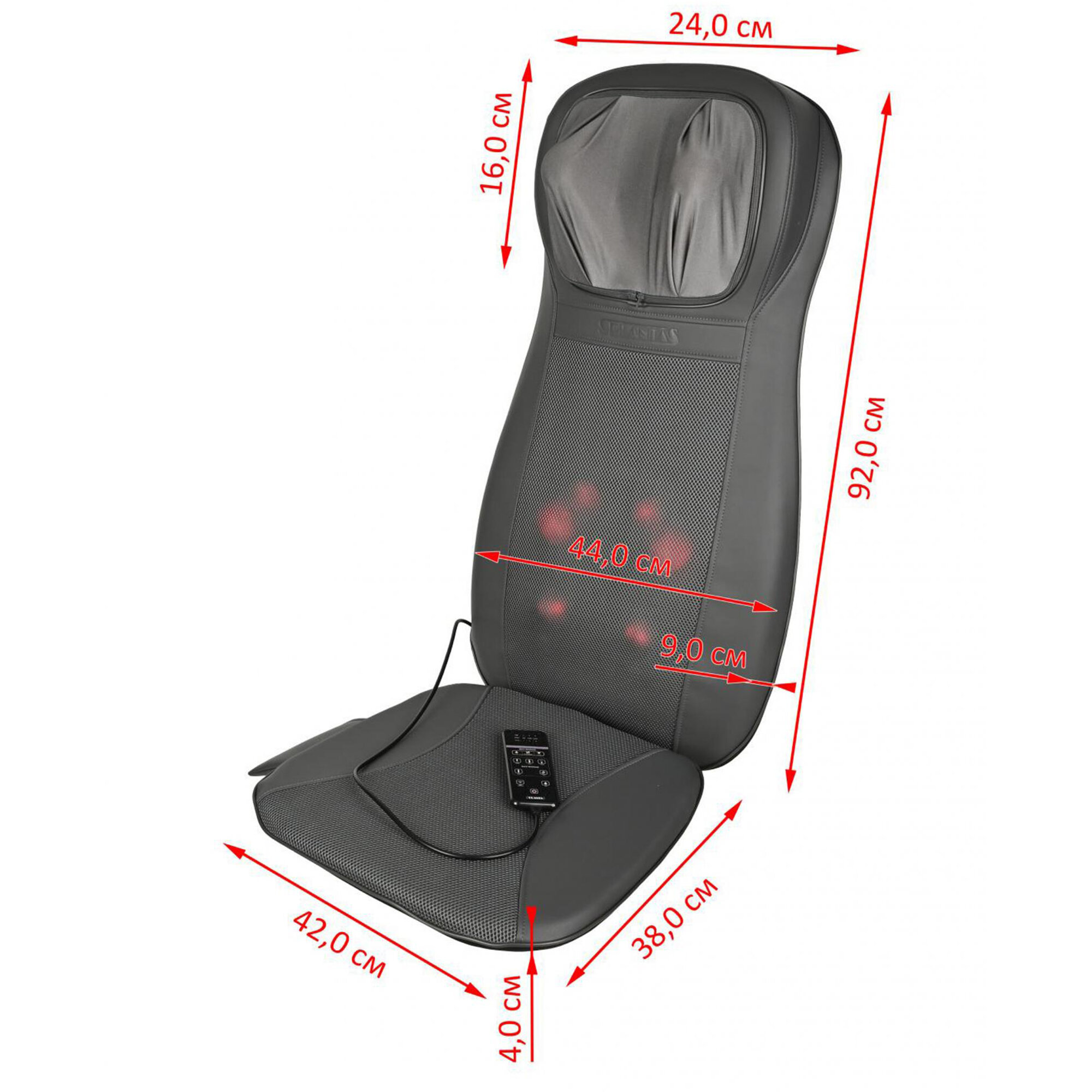 | Минусы: | в описании указано, что есть массаж плеч, это не так. Ролики максимум доходят до лопаток. Если вам нужен массаж верхней части спины, эта накидка точно не для вас. Это самое большое разочарование и самый большой минус. Кармашек для пульта расположен на сидушке, поэтому, когда пытаешься перенести накидку или поднимаешь сидушку, пульт вываливается |