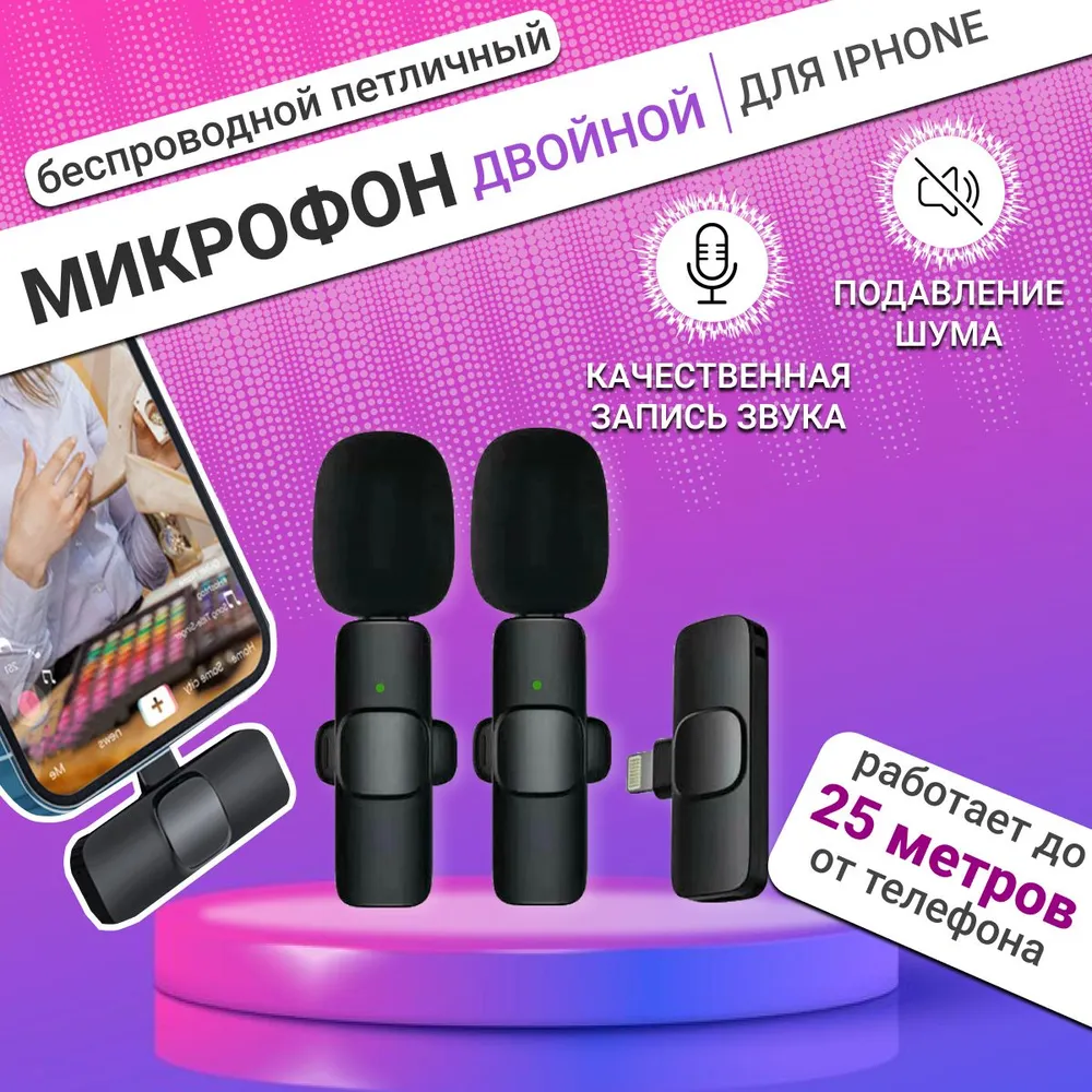 Микрофон петличный беспроводной, с шумоподавлением, петличка, для мобильного телефона, разъем Lightning, для Iphone, черный, 2шт