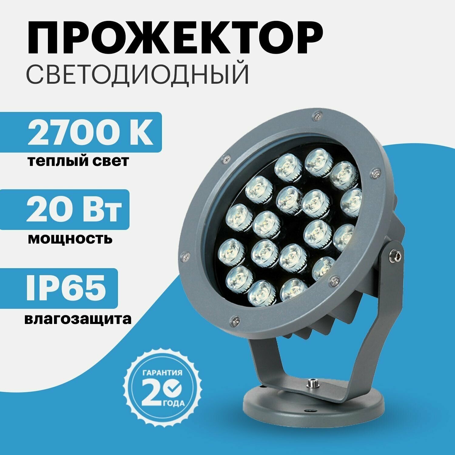 Прожектор светодиодный сдо-архитектор 20Вт 1600Лм 2700K теплый свет (110-240В, 2PIN, угол рассеивания 14°), серый корпус REXANT 1 шт арт. 605-031