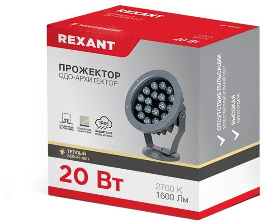 Прожектор Rexant Сдо-архитектор 20Вт 1600Лм 2700K серый корпус, напряжение 110-240В, подключение 2PI .