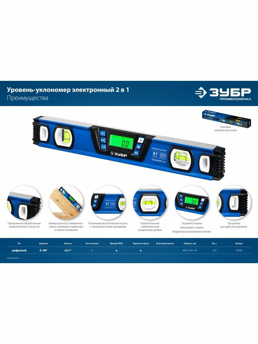 Горизонт уровень-уклономер, 400 мм, Диапазон 0-90°, Точность ±0,1°, Подсветка экрана, Профессионал ЗУБР 34286