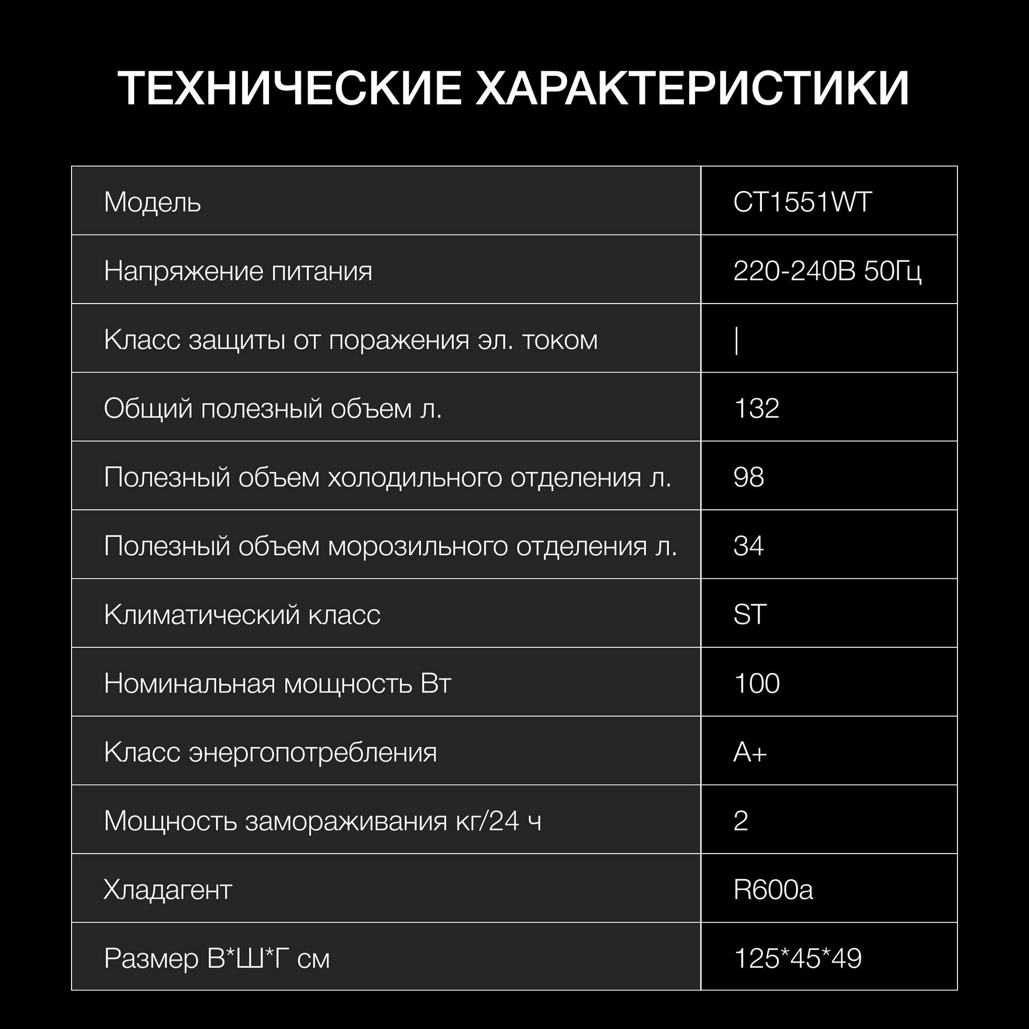 Холодильник двухкамерный с верхней морозильной камерой HYUNDAI CT1551WT, Объем 133л, Класс A+, Уровень шума 39 дБ, LED освещение, Высота 126,5 см, Белый