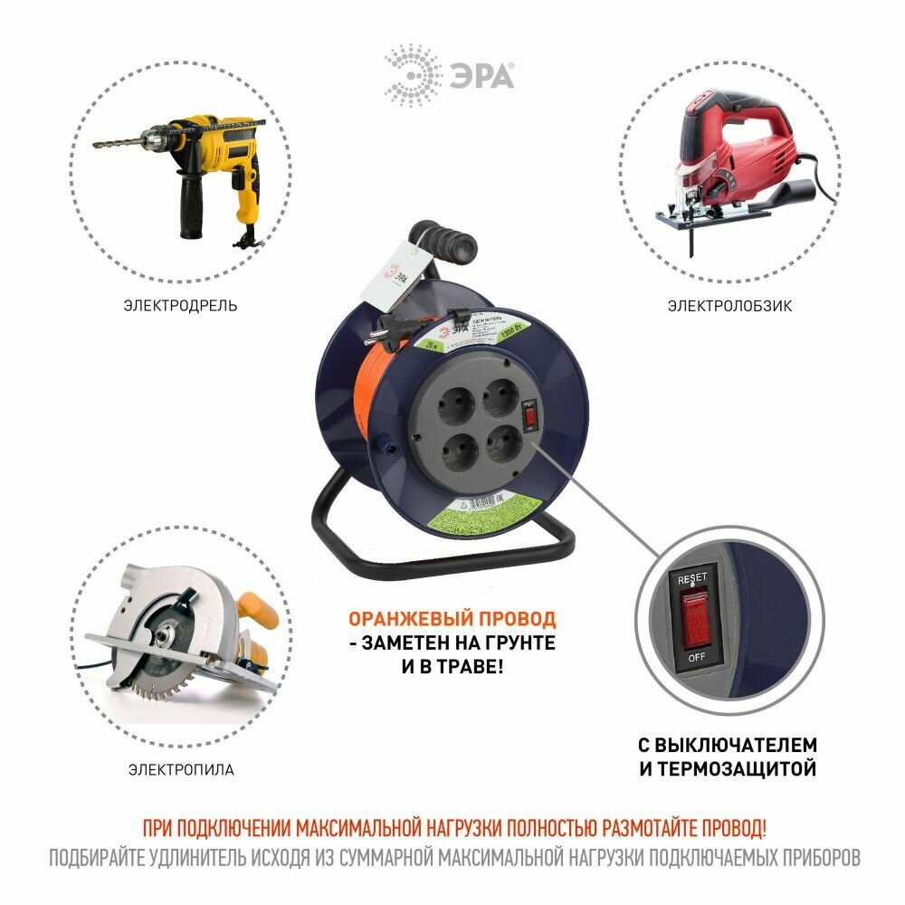Удлинитель строительный силовой Эра RPx-4es-3х0.75-30m на катушке с заземлением и выключателем 30 метров 4 розетки 6А